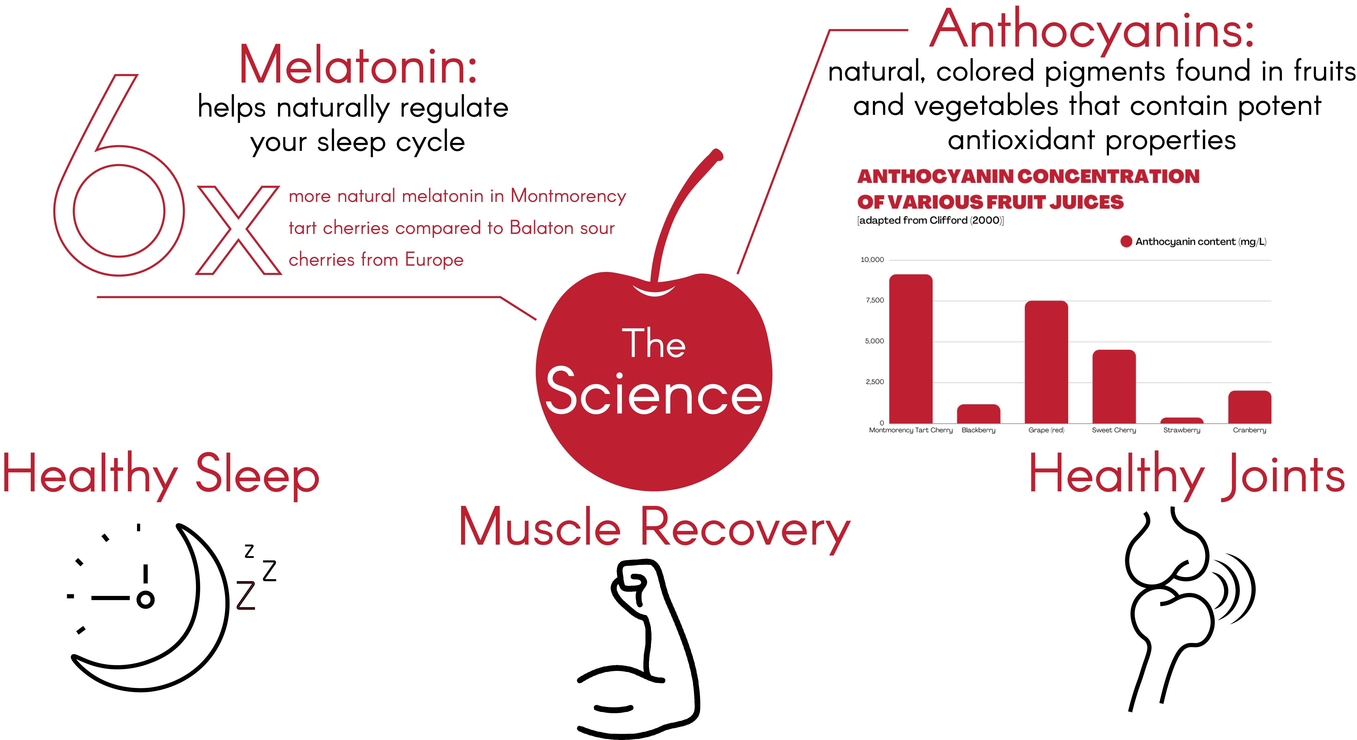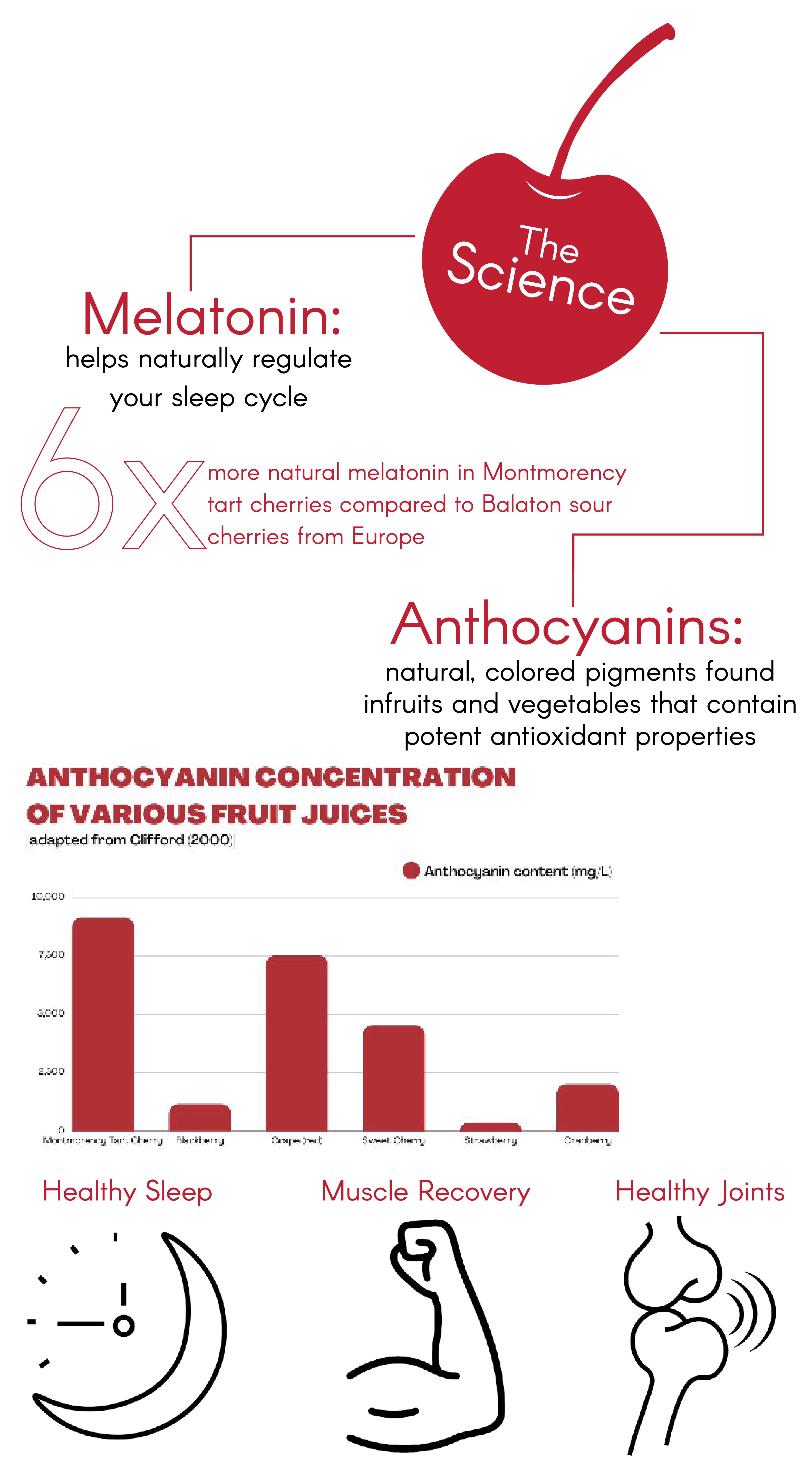- Effect of tart cherry juice (Prunus cerasus) on melatonin levels and enhanced sleep quality. Howatson G, Bell PG, Tallent J, Middleton B, McHugh MP, Ellis J. Eur J Nutr. 2012;51(8):909-16. DOI: 10.1007/s00394-011-0263-7.